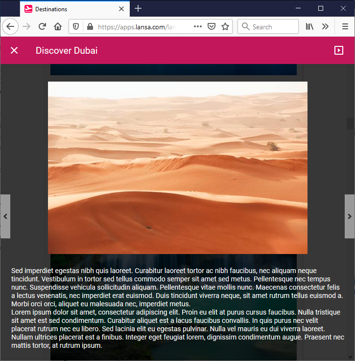 行き先のサンプルアプリケーションでは、ナビゲーションへの進む、戻るのボタンが付いた画像のカルーセルを表示します。