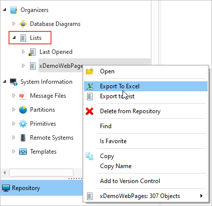 リストのコンテンツを .csv ファイルにエクスポートすることができます。リストを右クリックしてコンテキスト・メニューを開きます。Excelにエクスポートを選択します。ファイルをどこに保存したいかを指定します。.csv ファイルを開きます。