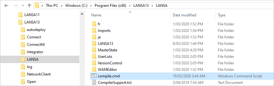 Compile.cmd ファイルは、<ルートディレクトリ>\LANSA にあります。 <ルートディレクトリ> はVisual LANSAがインストールされているルートディレクトリです。