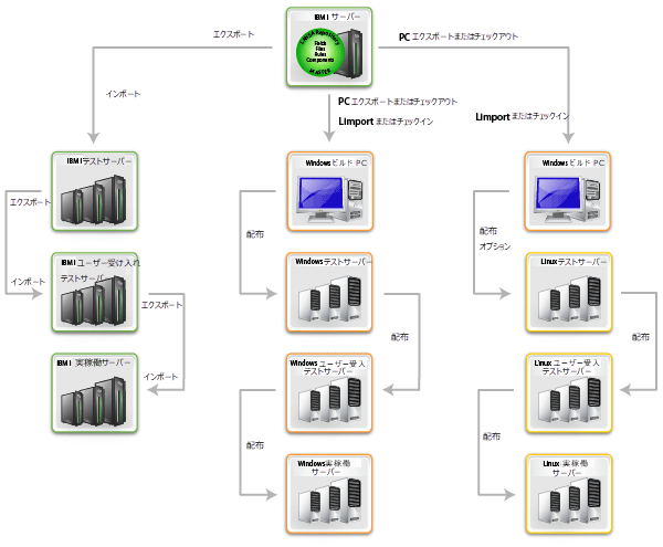 IBM i マスターの場合、以下のように IBM i 、Windows、Linux のテスト環境に配布します。