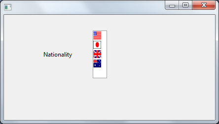 フィールド・コンポーネントのソースに、ピックリスト・ビューの設定 (PRIM_EVPL) お よびピックリストの定義を追加します。この2つは別々のクラスであることに注意してください。国を表すピックリスト項目を追加し、それぞれに画像を設定してください。PRIM_EVPLのAppearanceプロパティをImageに変更します。いったんフィールドを保存し、フォーム上でVisualPicklistクラスを使います。