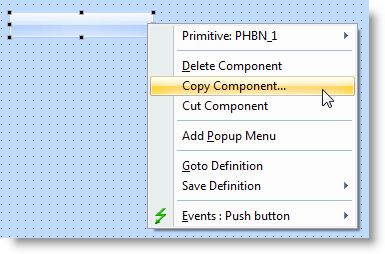 このポップアップ・メニューでは、(追加ボタンの) コンポーネントのコピー、切り取り、または削除ができます。また、ボタンのポップアップ・メニューを作成したり、ボタンの作成に使用される DEFINE_COM ステートメントに移動することもできます。ポップアップ・メニューは、ボタンの Click イベントと Initialize イベントのショートカットも提供します。ポップアップ・メニューで使用できるイベントは、コンポーネントによって異なります。