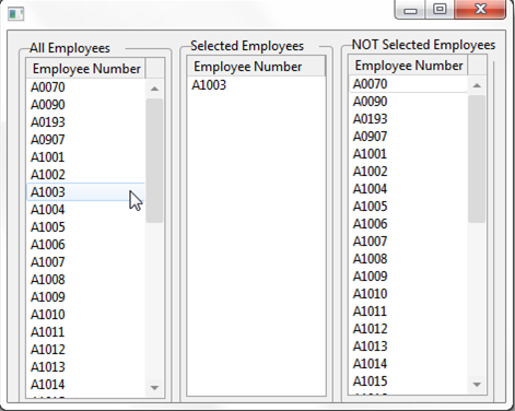 この例では、3つのリスト・ビューを使用します。起動時に、すべての社員が全ての社員と選択されない社員のリスト・ビューに追加されます。社員が全ての社員リストで選択および選択解除されると、選択された社員リストと選択されない社員リストで追加および削除されます。