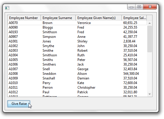 この例では、SELECTLISTステートメントを使用してリスト内のアイテムを操作し、UPD_ENTRYコマンドを使用して更新する方法を説明します。リスト・ビュー列には、社員名とその賃金が表示されます。[昇給]プッシュ・ボタンがクリックされるたびに、リスト内の各社員の賃金が10%増加します。