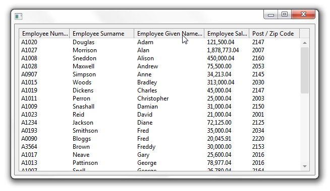 この例では、社員番号、名前、賃金、郵便番号のリスト・ビューがあります。ユーザーは、好きな列の先頭をクリックし、いつでもリストを動的にソートできます。