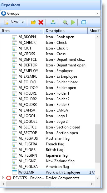 エディターでWRKEMPを開きます。リポジトリタブのグループタブのDEMONSTRATIONグループを開きます。このグループには、このグループに保存されているすべてのフォームが表示されます。