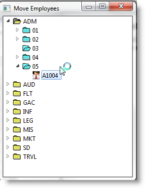 この例には、部門、セクション、社員のツリー・ビューがあります。ドラッグ・アンド・ドロップにより社員をセクション間で移動できます。