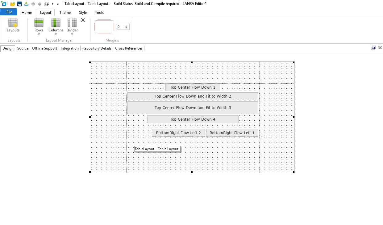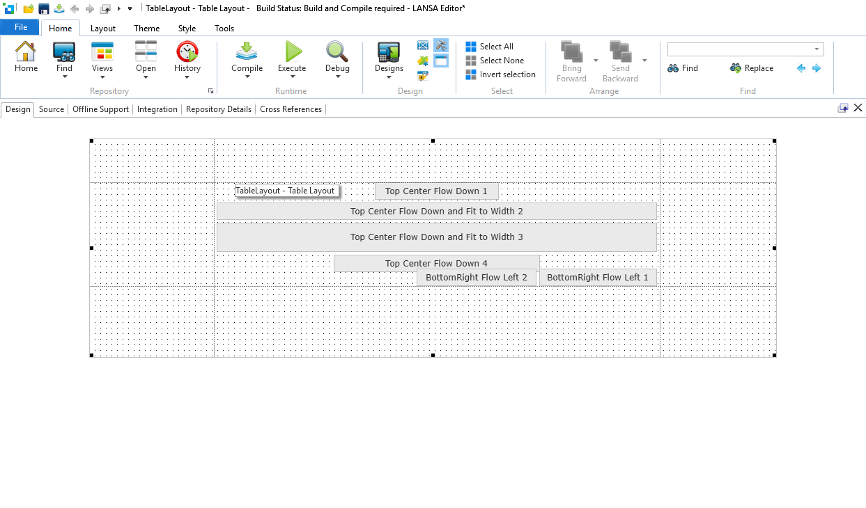 図 7 には、 2 組のフロー状態のコントロールがあります。最初の 1 組は、[配置] が [中央上] に、[フロー] が [下] に設定されています。ここで、もう 1 点注意しておくことは、コントロールのうち 2 つがセルの幅になっていることです。2 組目は、[配置] が [右下] に、[フロー] は [左] になっています。