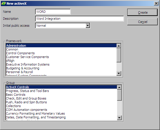 Microsoft Wordアプリケーションをリポジトリに登録するため、ActiveXコンポーネント・グループに、「Word」というコンポーネントを作成してください。