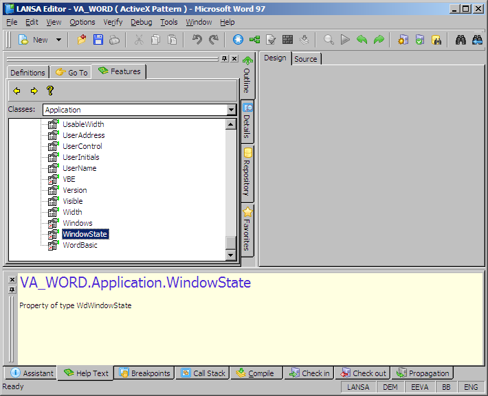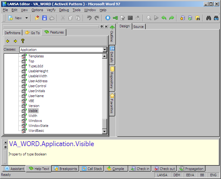 「Word Application」コントロールのVisibleプロパティは、Wordウィンドウの表示の有無を制御するために使います。このプロパティに設定できる値の型については、機能ヘルプ(F2)を参照してください。