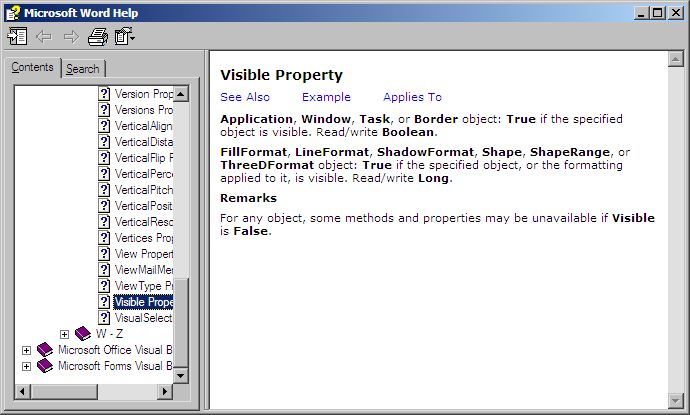 より詳しい情報はF1キーを押すと参照できます。ただし、これは、WordやOfficeと併せてVisual Basic Helpもインストールした場合に限ります。