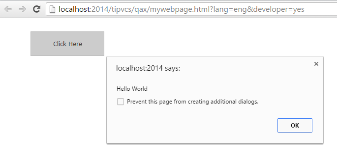 再度 [ホーム] リボンから Web ページを実行すると、デフォルトのブラウザが起動し、デフォルトの Web サーバー上にある、次のような "Hello World" アプリケーションが実行されます。ボタンをクリックして、警告をアクティブ化してみるのも忘れないでください。