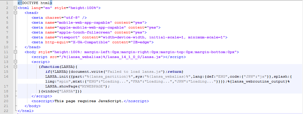 まず初めに、<script></script> タグ間のコードを見ると、ページを定義する静的 HTML がありません。その代わりに、生成されたコードは LANSA ランタイム (lansa.js) のロードを開始させ、コンパイルされたページを表示するよう指示しています。引き続きLANSA ランタイムは、ユーザーのページの JavaScript (mywebpage.js) をロードし、ユーザー・インターフェースを作り上げるコードを実行します。