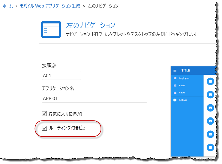 - [左のナビゲーション] をクリックして、オプション [ルーティング付きビュー] にチェックマークを入れます。