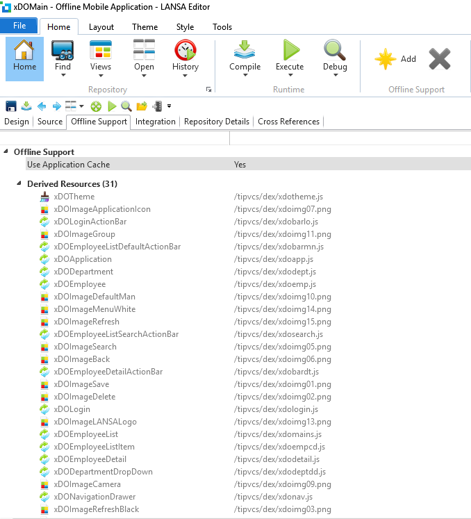適切なリソースが追加されたキャッシュ・マニフェスト・ファイルを利用することで、オフライン時にユーザーがリフレッシュ・ボタンを押しても、アプリケーションはロードされ、正しく作動するのです。この場合、ブラウザはキャッシュ・マニフェスト・ファイルそのものが変更されると (Web ページの再コンパイル時)、リソースをリフレッシュするのみです。 例えばサンプルのアプリケーションのオフライン・サポート付きのモバイル・アプリには Web ページ xDOMain があります。これを開くと、派生リソースのリストが表示されます。