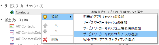 以下のイメージの例では、ストレージ・バケットの名前が Contacts となっています。 [サービスワーカー キャッシュ リソースの追加] オプションを選択すると、特定のリソースの識別子を指定できるようになります。