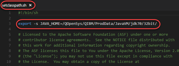 ダウンロードした ZIP パッケージは、デフォルトでは /QOpenSys/QIBM/ProdData/JavaVM/jdk70/32bit/ にある JAVA ランタイムを使用します。通常はこれを変更する必要はありませんが、何らかの理由でこれを変更する必要がある、もしくは 別の Java のバージョンを使用したい場合は、<your-tomcat-root>/bin にある setclasspath.sh ファイルの変数 JAVA_HOME を変更することが可能です。