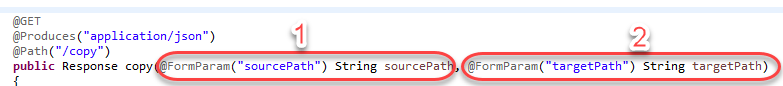 この 2 つの引数は、FormParam でコメントが付けられます。これは、パラメータが応答の本文 (URL エンコーディングされたキーと値のペアの形式) で指定されることを示しています。