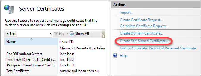 最初に行わないといけないことは、(IIS を使って) 自身が署名した SSL の証明書を作成することです。