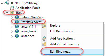 (Sites の) DotNetServices ノードで右クリックし、[バインドの編集] を選択します。