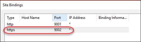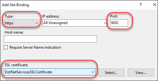 [タイプ] はドロップダウンから [https] を選択し、[ポート] には未使用のポート番号 (例: 9002)、そして [SSL 証明書] には先程作成した証明書 (DotNetServicesSSLCertificate) を設定します。