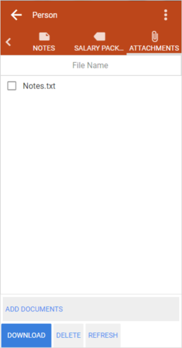VLF-ONE をモバイル・デバイス上で実行してる場合 (小型または中型の画面)、ハンドラー DF_DOC_Mobile が表示され、ユーザーは ADD DOCUMENTS ボタンをタッチすることで、ファイルをアップロードできます。