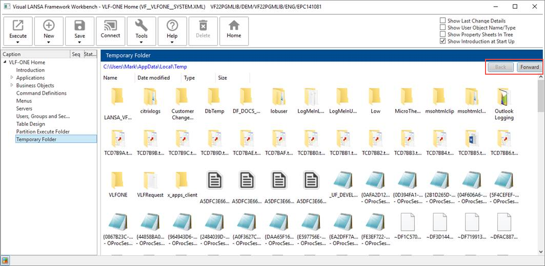 VLF の開発者ワークベンチ のフォルダ・エクスプローラには、戻ると次へのボタンが用意され、サブフォルダへの移動がしやすくなりました。