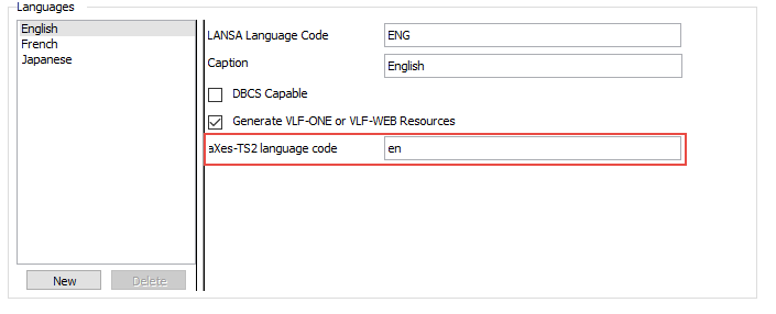 aXes-TS2 言語コードは、Visual LANSA フレームワーク/LANSA 言語に関連付けられた、RAMP セッションで使用される言語コードです。これは、VLF-WIN または VLF-ONE アプリケーション内で、aXes-TS2 実行エンジンと RAMP を使用している場合のみ必要です。