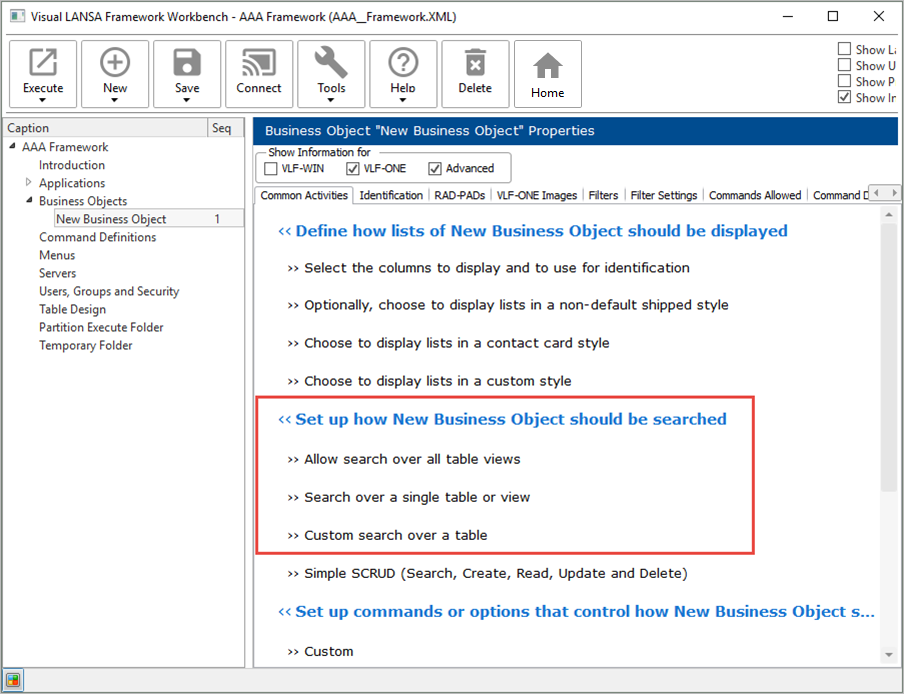 この演習では、新規ビジネス・オブジェクトが必要です。(「ビジネス・オブジェクトを手動で作成」を参照)ビジネス・オブジェクトを選択し、[共通のアクティビティ] を表示します。