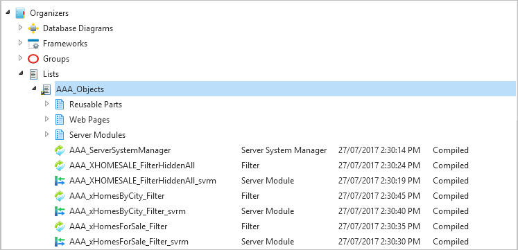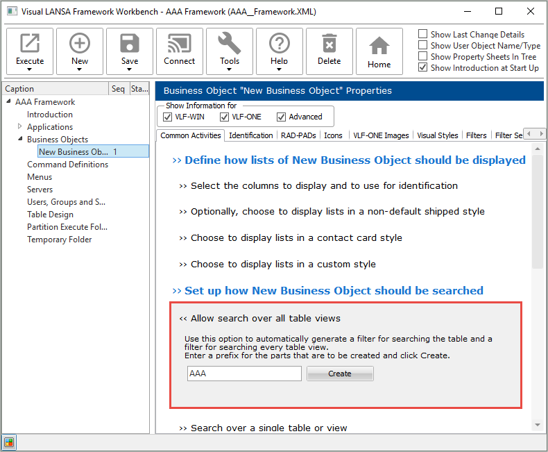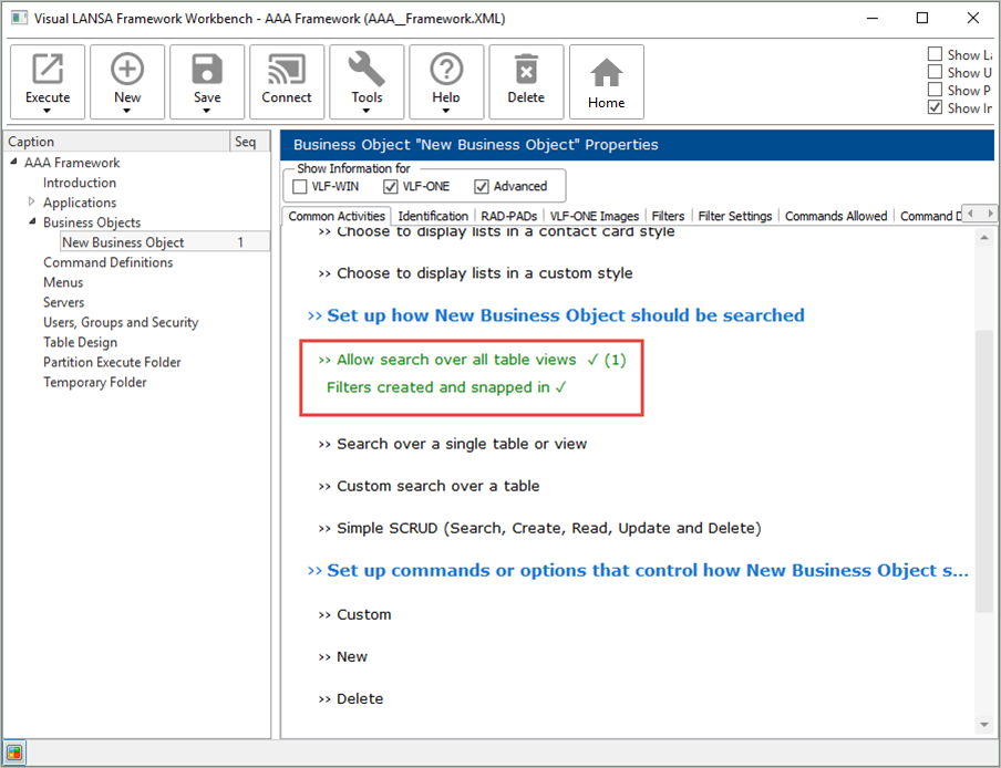 Visual LANSA エディターに切り替えて、自分のフレームワークのリポジトリのトラッキング・リストを表示させ、このビジネス・オブジェクトに対して作成されたフィルターと関連サーバー・モジュールを確認します。