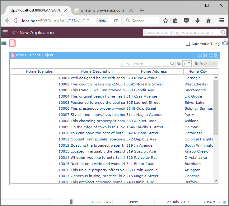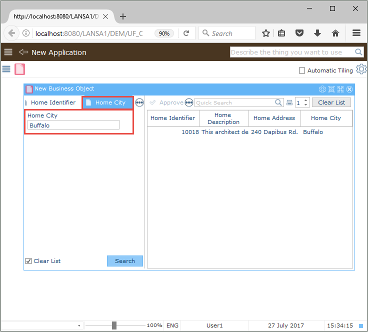 フィルターを生成する前に、インスタントリストのテーブル、列、識別子を設定する必要があります。(詳細は「インスタンスリストの定義」を参照)この例では、ビジネス・オブジェクトに関連付けられているテーブルは xHomesForSale です。