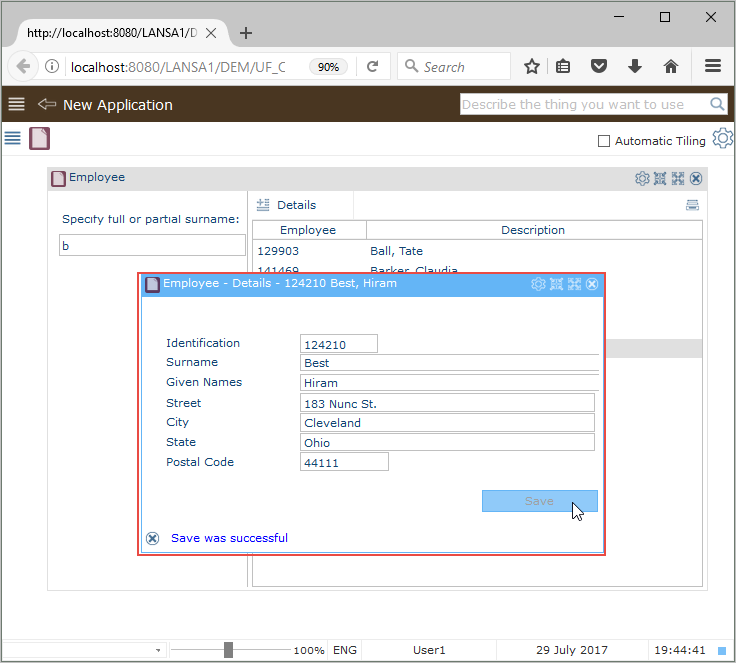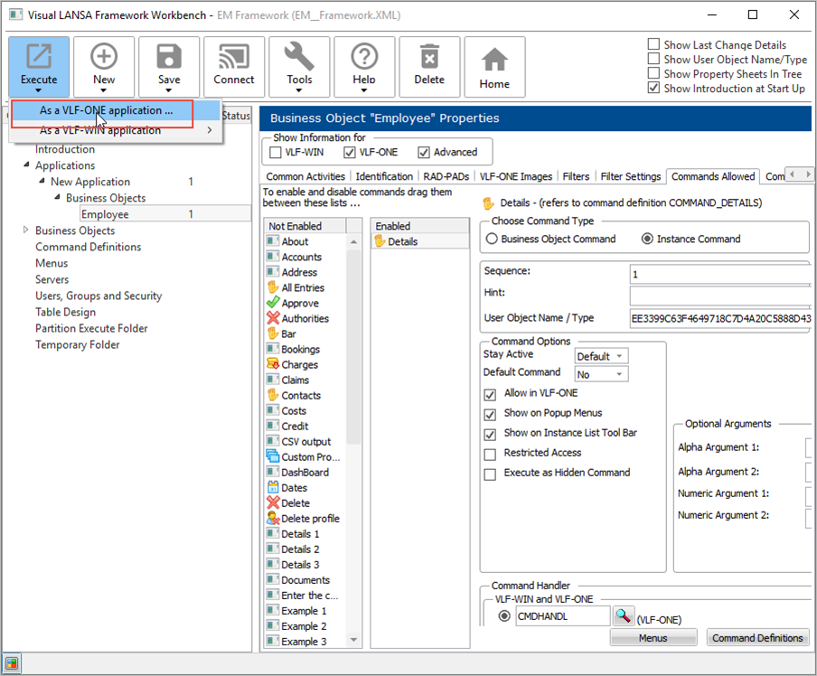 省略値の実行オプションを使い、フレームワークにサインインします。"社員" ビジネス・オブジェクトを選択してください。