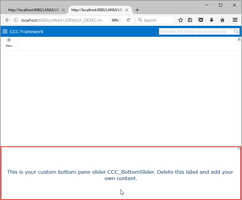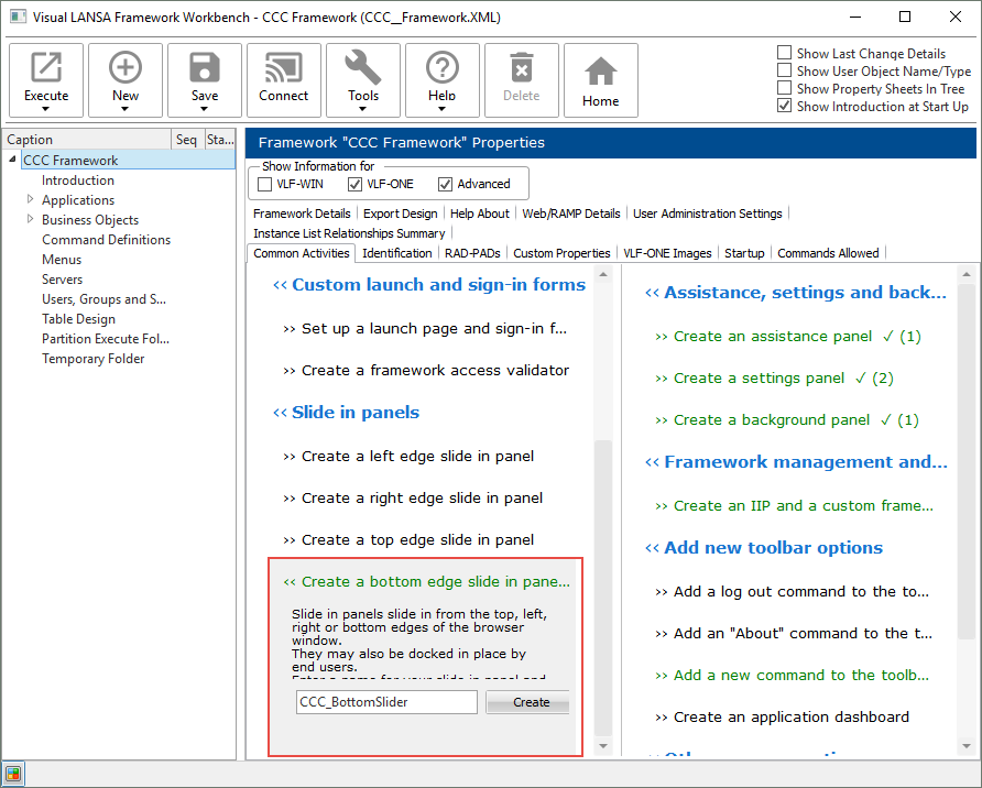 フレームワークの [共通のアクティビティ] タブで、スライドイン・パネルを展開して、[下端スライドイン・パネル作成] を選択します。