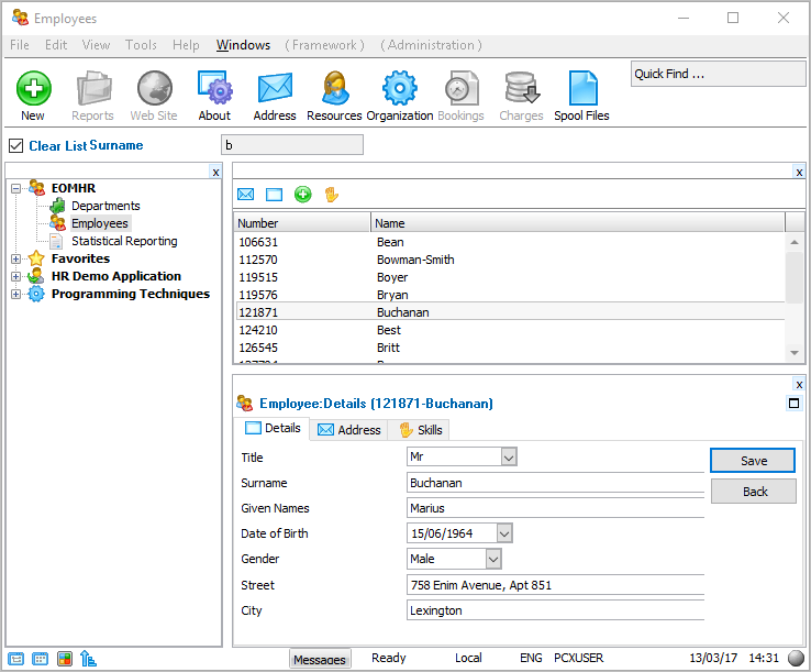 "社員" と "統計レポート" - "社員" ビジネス・オブジェクトには、名前、配属、日付という 3 つの フィルター と、社員の "詳細"、"住所"、"スキル" を処理するコマンド・ハンドラーが組み込まれています。さらに、エンドユーザーが新たに社員を定義するための新規作成コマンドもあります。