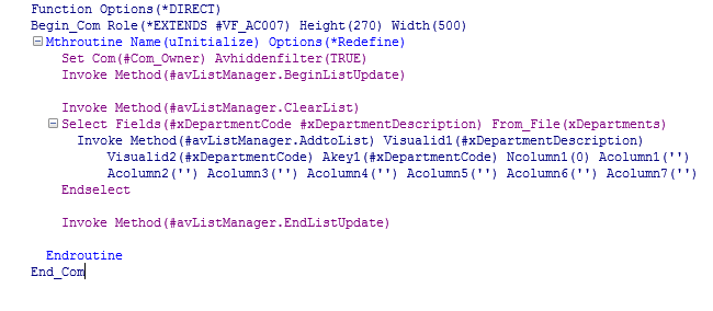 Invoke Method(#avListManager.AddtoList) Visualid1(#xDepartmentDescription) Visualid2(#xDepartmentCode) Akey1(#xDepartmentCode) Ncolumn1(0) Acolumn1('') Acolumn2('') Acolumn3('')