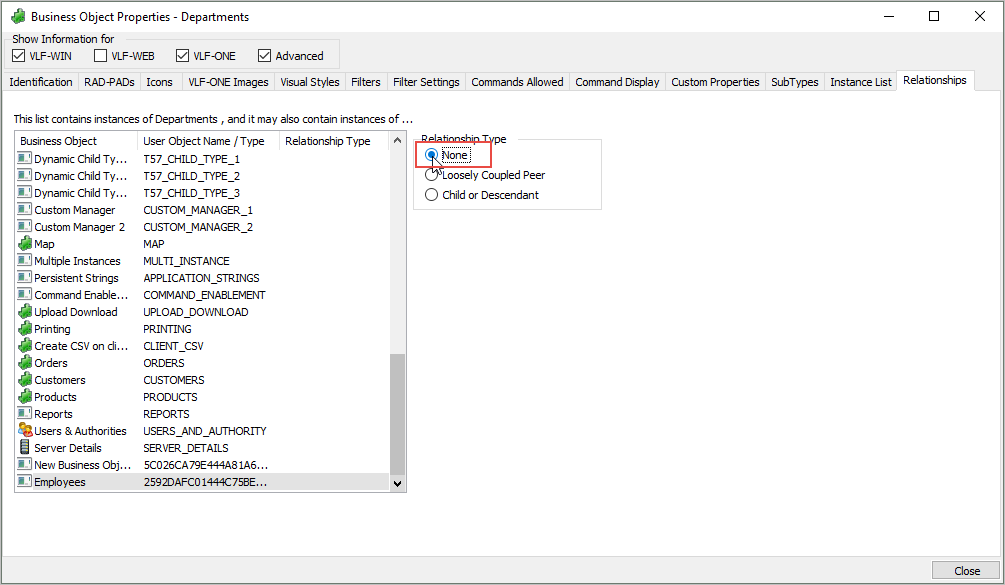 - "部門" ビジネス・オブジェクトのプロパティを閉じます。