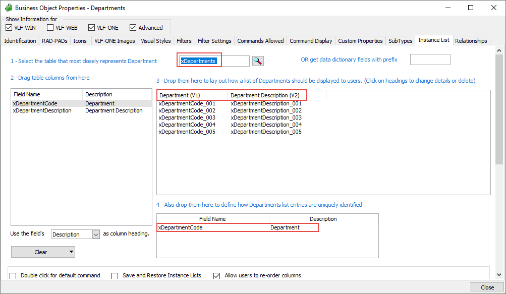 - xDepartmentCode をインスタンスリスト識別子にします。