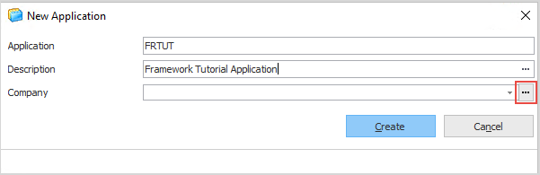 定義済みの会社が無い場合、会社プロンプトから会社ダイアログの作成ボタンを使って会社を作成します。 - 会社を選択したら、アプリケーションを作成します。