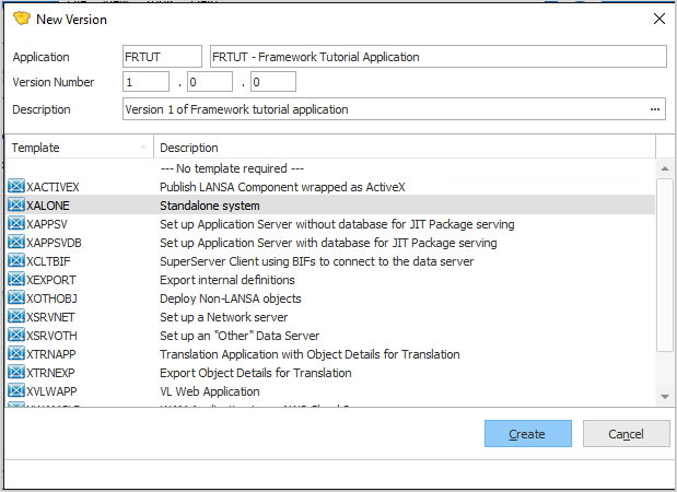 アプリケーションが作成され、[新しいバージョン] ダイアログが表示されます。 - XALONE というパッケージ・テンプレートを使って、アプリケーション iiiTUT 内にバージョンを作成します。