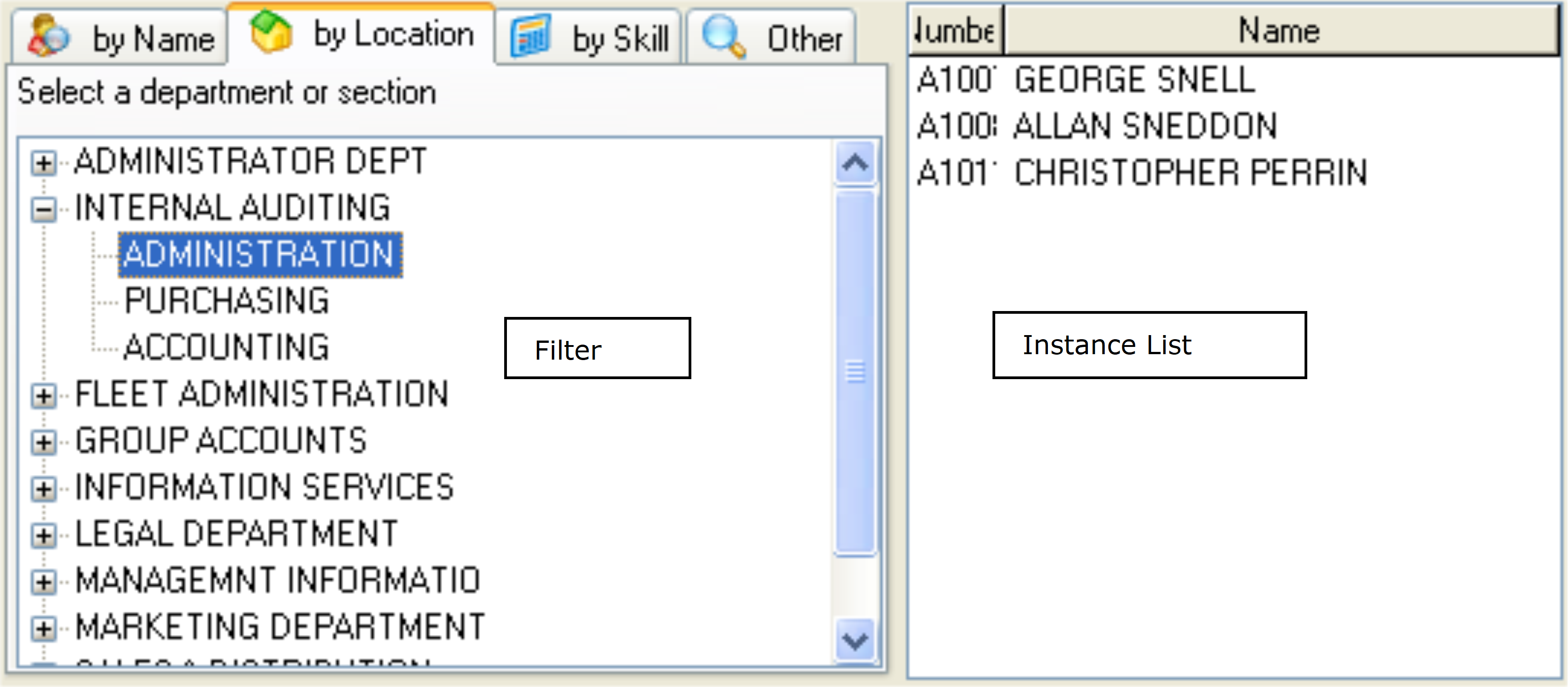 ドリル・ダウン・フィルターはツリー構造で部門 (レベル1) と、関連する課 (レベル2) を表示します。ツリーから部門を選択し、選択した部門内の課へドリル・ダウンすることができます。 ツリーの部門や課を選択すると、関連する社員が瞬時にインスタンスリストに表示されます。