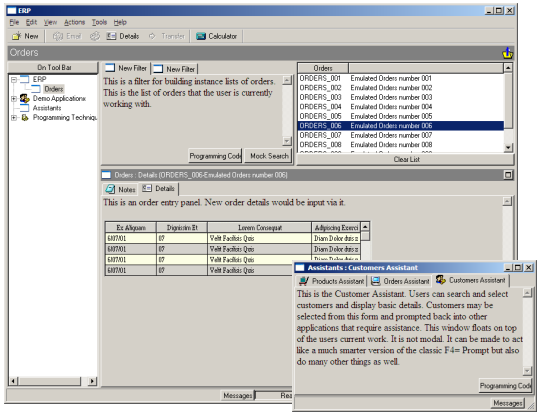 アシスタント・ウィンドウはエンドユーザーが現在使用中のメイン・フレームワーク・ウィンドウの前面に表示されます。アシスタントはメイン・ウィンドウのアプリケーションと任意の方法で対話処理が可能です。例えば、Customer Assistantで顧客を選択すると顧客番号が下のOrder Entryフォームの顧客番号入力フィールドに表示される場合があります(これは従来の非モーダルなF4=プロンプト対話処理です)。
