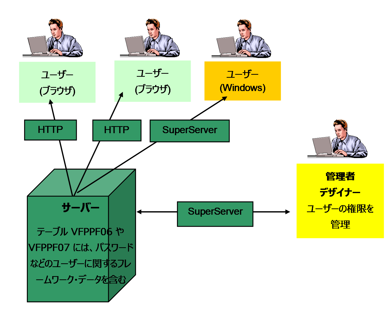 ユーザーに関するデータ、パスワード、フレームワーク・オブジェクトに対する権限(アプリケーション、ビジネス・オブジェクト、コマンド)は通常フレームワークが動いているLANSA区画のデータ・ライブラリの中のテーブル VFPPF06およびVFPPF07に保存されます。これらは通常の LANSA テーブルなので、ユーザーの詳細がサーバーに保存されているかどうか容易にチェックできます。