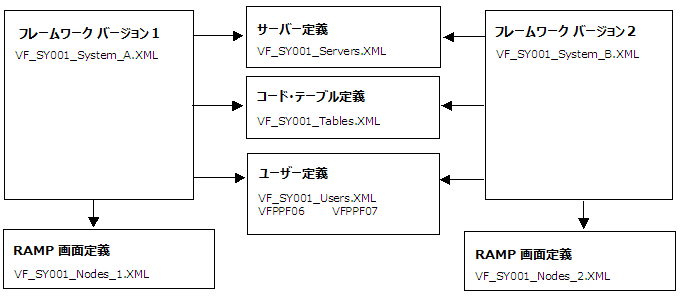 フレームワークのバージョンには、サーバー、コード・テーブル、ユーザー、RAMP画面の定義(ノード)に対する関連XMLファイルがあります。一部のフレームワークのバージョンでは、これらの定義ファイルを共有するか、独自の定義ファイルを保有することができます。