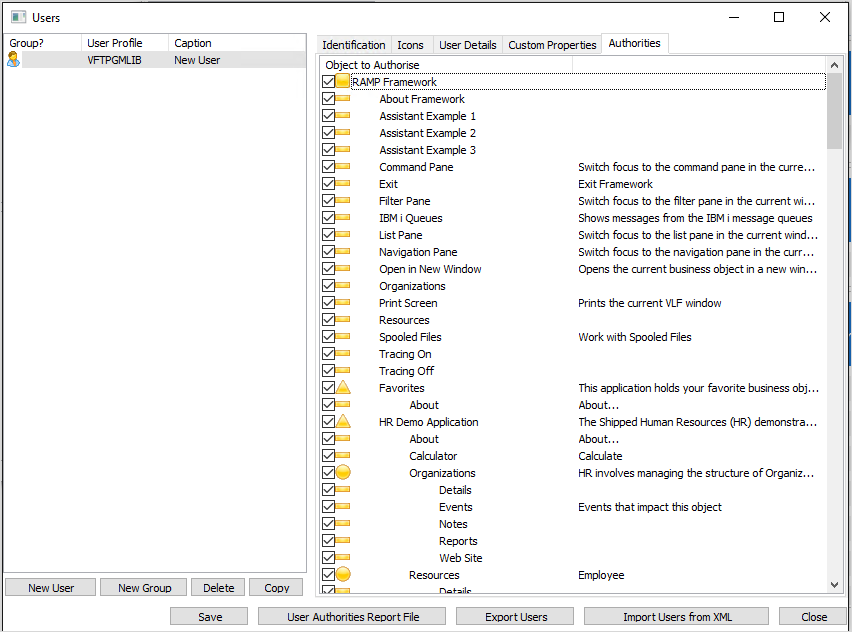 このタブを使用して、選択したユーザーのフレームワーク・オブジェクトに関する権限を設定します。
