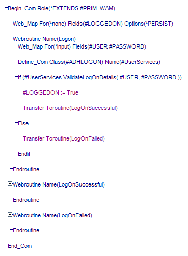 LogonWebroutineは、プレゼンテーション層で表示される他のWebroutineから、ユーザーIDやパスワードを受け取ります。再利用可能パーツのインスタンスであるADHLOGONが活性化され、そのValidateLogOnDetailsメソッドを使ってユーザーIDとパスワードの妥当性検査が行われます。ログオンが成功した場合は、#LOGGEDONフィールド(永続的なセッションデータとして宣言されたもの)にTrueがセットされ、コントロールがLogOnSuccessfulWebroutineに送られます。ログオンが失敗した場合は、コントロールは LogOnFailed Webroutineに送られます。