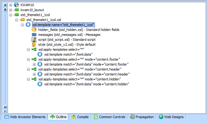 LANSA エディターの [アウトライン] タブでWAMレイアウトのウェブレット上でダブルクリック(もしくは右クリックして、コンテキスト・メニューから [ウェブレット: kwam10_layout ] - [開く] を選択)することで、kwam10_layout.xsl ウェブレットを開くこともできます。このWAMレイアウトのツリー構造を見ると、さらに別のウェブレットが参照されているのが分かります。この場合は、std_themelet1_1col ウェブレットです。自動的に生成されたXSLオブジェクトにおいてさえも、ウェブレットが再利用されている様子が分かると思います。