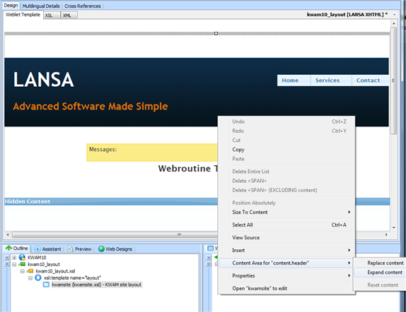 [アウトライン]タブ(または[デザイン]ビュー)で std_themelet1_1col ウェブレットの構造を確認すると、content.header、 content.hidden および content.footer というテンプレート名で識別されるページ・コンテンツ・エリアへの参照があります。これらの名前が kwam10_layout の [アウトライン] ビューで特に表示されていなかったとしても、これらは kwam10_layout とkwam1001Webroutine の両方のWebデザインで、LANSAエディターを使って編集可能なエリアです。