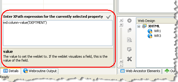インラインでないリストでは、$COLUMNNAME XSL変数の列の値またはキー('field-value', 'FIELDNAME')のようなXPath式のフィールド値 にアクセスします。インライン・ウェブレットの中のXSLは設計時に実行されるため、このようなXSLは実行時のデータ・アクセスに使用することはできません。ウェブレット・プロパティで実行時のデータにアクセスするのに使用できる特別XSL拡張ファンクションがいくつかあります。次のようなものです。