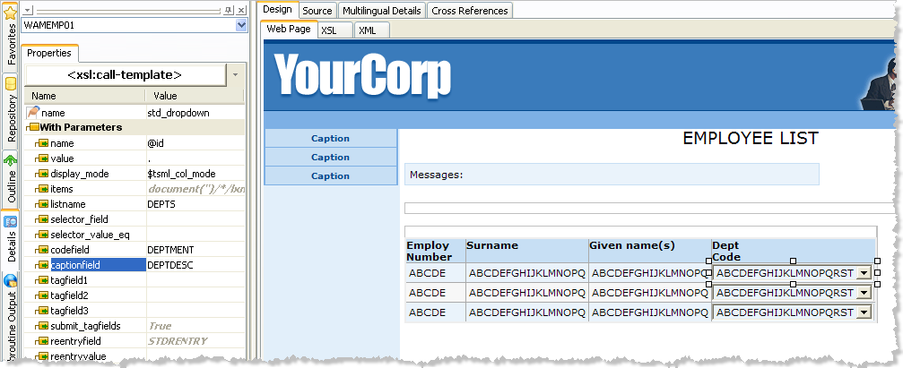 5. codefieldプロパティにDEPTMENTを、captionfieldプロパティにDEPTDESCを設定します。グリッドは、以下のようになります。