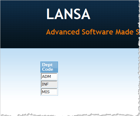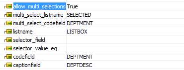 - codefieldプロパティはリスト・エントリーのコード値を保持するlistnameリスト内のフィールド名です。(この場合、DEPTMENT 部門コード)